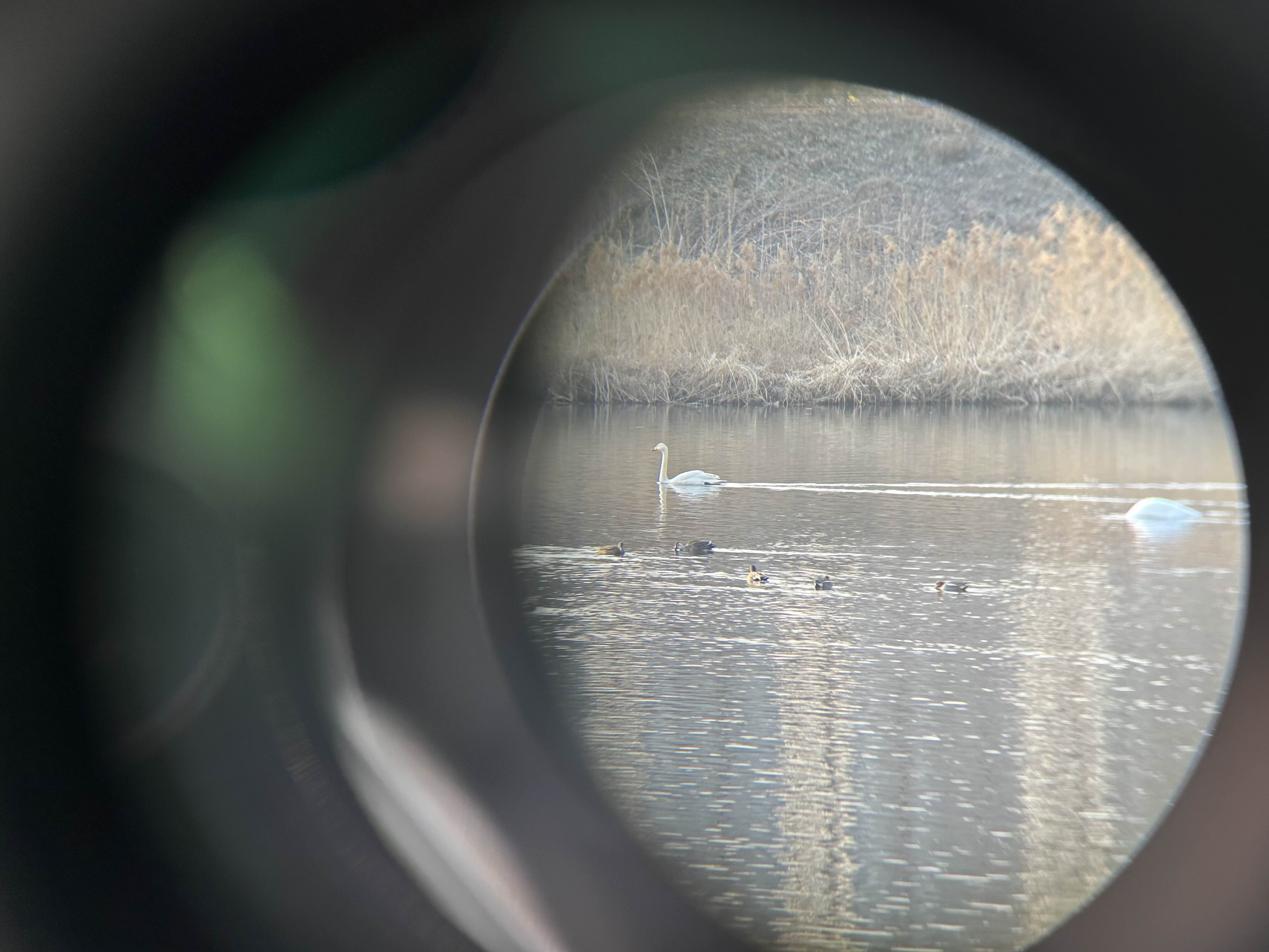 큰고니 두 마리가 먼저 눈에 들어온다. 그 주변에 있던 작은 철새들은 청둥오리 수놈들과 암놈들이다. 이걸 눈으로 볼 수 있다니!